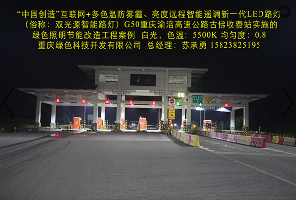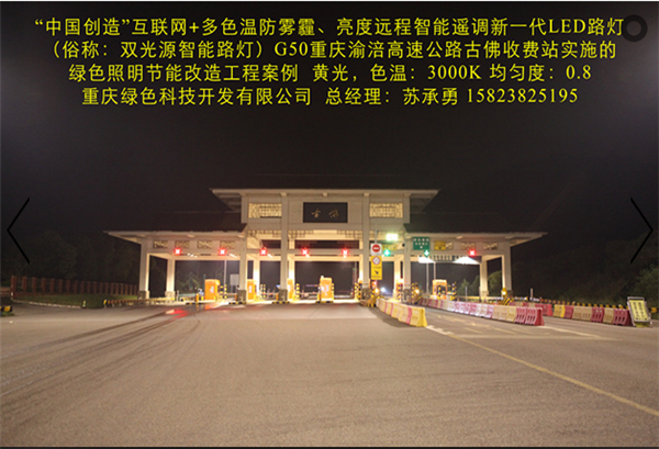 我司在G50重慶渝涪高速公路古佛收費站實施的“中國創(chuàng)造”互聯(lián)網(wǎng)+多色溫防霧霾LED全智能路燈綠色照明節(jié)能改造工程,使用的“中國創(chuàng)造”互聯(lián)網(wǎng)+多色溫防霧霾LED全智能路燈及智能管理系統(tǒng),其具備多項特點:(一)通過PM2.5、溫度、光敏、色溫、超聲波雷達等傳感器、高清攝像頭自動采集智慧城市所需的環(huán)保、氣象、交通、安防等公共數(shù)據(jù)信息,通過“云平臺”實現(xiàn)共享,并利用智慧城市網(wǎng)絡(luò)、LED彩屏、微信、短信等信息平臺,向社會免費提供各類信息及Wifi等服務(wù)。(二)在不同氣候和季節(jié),可根據(jù)人們的感官需求及環(huán)境氣候的變化,通過溫度、濕度、PM2.5等傳感器遠程智能調(diào)控?zé)艟叩纳珳亍⒘炼?,實現(xiàn)多種色溫、亮度舒適安全照明。遠程智能控制系統(tǒng)自動采集照明環(huán)境溫度、雨、霧、霾、雪、沙塵等數(shù)據(jù),智能將燈光色溫精細化調(diào)節(jié)到最舒適、最安全的照明值。在雨、霧、霾、雪、沙塵暴等惡劣天氣下,通過遠程智能控制系統(tǒng)(包括手機APP)調(diào)控?zé)艄庹彰魃珳兀褂么┩改芰姷狞S光(3000K色溫)照明,有效保障了在雨、霧、霾、雪、沙塵暴天氣下城市路燈安全照明和行車安全;在正常天氣下,根據(jù)環(huán)境溫度將燈光色溫智能調(diào)控為最舒適照明狀態(tài)。(三)根據(jù)不同時間段、光照度、車流量等情況,分別通過光敏、超聲波、雷達等傳感器智能調(diào)控?zé)艟?,實現(xiàn)多種亮度燈光照明模式。可在不同時段將燈光智能調(diào)整為“白天”、“夜間”、“夏季”、“冬季”、“防霧霾”等多種照明模式,從而極大提高節(jié)電率,同時有效解決隧道照明為了節(jié)電普遍采用的關(guān)閉控制回路或者間隔關(guān)燈方式而造成照明暗區(qū),存在交通安全隱患的問題,實現(xiàn)無暗區(qū)的二次節(jié)能和安全、舒適照明,確保行車安全。(四)路面亮度均勻度、照度均勻度、節(jié)能率等重要參數(shù)均優(yōu)于LED路燈國家標準。互聯(lián)網(wǎng)+多色溫防霧霾LED全智能路燈一盞可當多盞普通單色溫LED路燈使用,性價比更高,可提高光效10%,延長燈具使用壽命一倍以上。智能調(diào)色、調(diào)光,確保照明更加舒適、安全、節(jié)能。