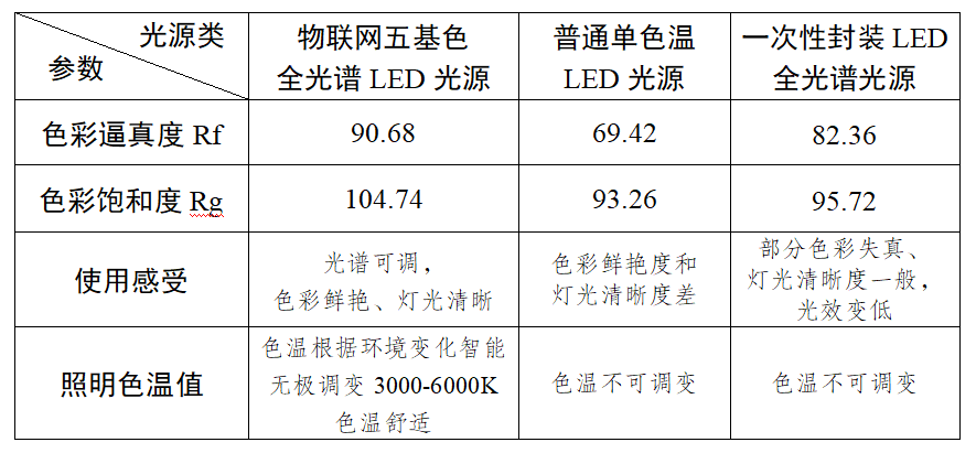 圖2 物聯(lián)網(wǎng)五基色全光譜多色溫LED光源與普通單色溫LED光源、一次性封裝LED全光譜光源參數(shù)對比