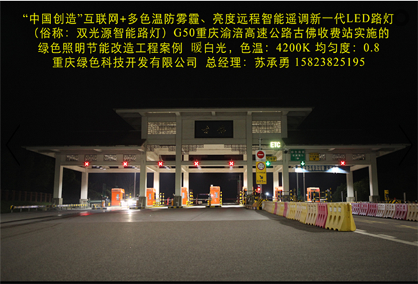 我司在G50重慶渝涪高速公路古佛收費站實施的“中國創(chuàng)造”互聯(lián)網(wǎng)+多色溫防霧霾LED全智能路燈綠色照明節(jié)能改造工程,使用的“中國創(chuàng)造”互聯(lián)網(wǎng)+多色溫防霧霾LED全智能路燈及智能管理系統(tǒng),其具備多項特點:(一)通過PM2.5、溫度、光敏、色溫、超聲波雷達等傳感器、高清攝像頭自動采集智慧城市所需的環(huán)保、氣象、交通、安防等公共數(shù)據(jù)信息,通過“云平臺”實現(xiàn)共享,并利用智慧城市網(wǎng)絡(luò)、LED彩屏、微信、短信等信息平臺,向社會免費提供各類信息及Wifi等服務(wù)。(二)在不同氣候和季節(jié),可根據(jù)人們的感官需求及環(huán)境氣候的變化,通過溫度、濕度、PM2.5等傳感器遠程智能調(diào)控?zé)艟叩纳珳亍⒘炼?,實現(xiàn)多種色溫、亮度舒適安全照明。遠程智能控制系統(tǒng)自動采集照明環(huán)境溫度、雨、霧、霾、雪、沙塵等數(shù)據(jù),智能將燈光色溫精細化調(diào)節(jié)到最舒適、最安全的照明值。在雨、霧、霾、雪、沙塵暴等惡劣天氣下,通過遠程智能控制系統(tǒng)(包括手機APP)調(diào)控?zé)艄庹彰魃珳兀褂么┩改芰姷狞S光(3000K色溫)照明,有效保障了在雨、霧、霾、雪、沙塵暴天氣下城市路燈安全照明和行車安全;在正常天氣下,根據(jù)環(huán)境溫度將燈光色溫智能調(diào)控為最舒適照明狀態(tài)。(三)根據(jù)不同時間段、光照度、車流量等情況,分別通過光敏、超聲波、雷達等傳感器智能調(diào)控?zé)艟?,實現(xiàn)多種亮度燈光照明模式。可在不同時段將燈光智能調(diào)整為“白天”、“夜間”、“夏季”、“冬季”、“防霧霾”等多種照明模式,從而極大提高節(jié)電率,同時有效解決隧道照明為了節(jié)電普遍采用的關(guān)閉控制回路或者間隔關(guān)燈方式而造成照明暗區(qū),存在交通安全隱患的問題,實現(xiàn)無暗區(qū)的二次節(jié)能和安全、舒適照明,確保行車安全。(四)路面亮度均勻度、照度均勻度、節(jié)能率等重要參數(shù)均優(yōu)于LED路燈國家標準。互聯(lián)網(wǎng)+多色溫防霧霾LED全智能路燈一盞可當多盞普通單色溫LED路燈使用,性價比更高,可提高光效10%,延長燈具使用壽命一倍以上。智能調(diào)色、調(diào)光,確保照明更加舒適、安全、節(jié)能。